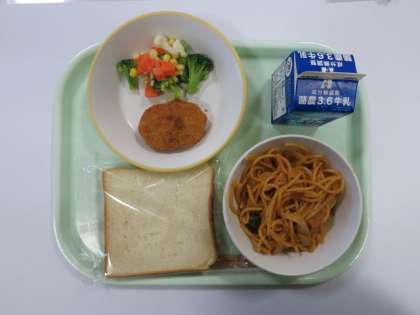 今日の献立は、スパゲッティナポリタン、コロッケ、カラフルサラダ、食パン、です。