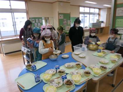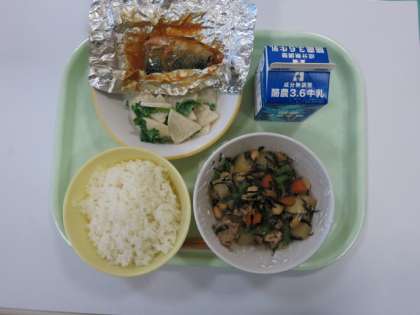 今日の献立は、さばのぎんがみ焼き、かぶのいろどり、だいずのいそ煮、です。