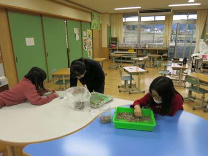 3年生 穫れた種を、実が詰まっているものとそうでないものに、分けていました。