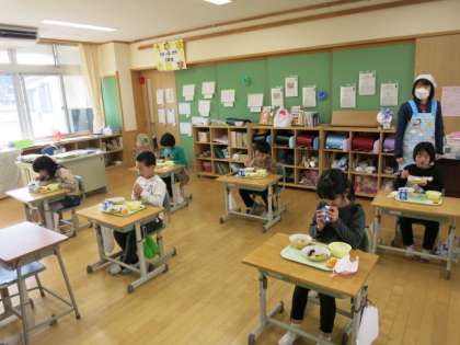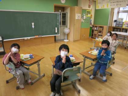 今日の献立は、いわしの梅煮、たまごとチンゲンサイのいためもの、いものこ汁、あいか、です。