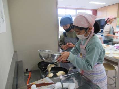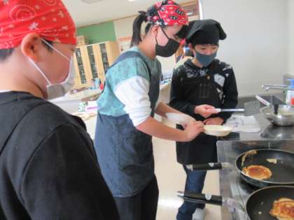 5・6年生はお楽しみ会でホットケーキ作りをしました。自分たちで計画した通りに調理を行い、おいしいホットケーキを作ることができました。