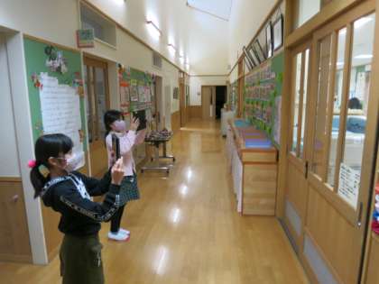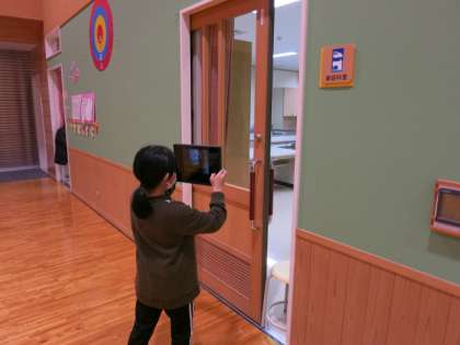 クロムブックで教室や部屋の写真を撮ってきて、「何の部屋ですか」と尋ねる活動を行っていました。