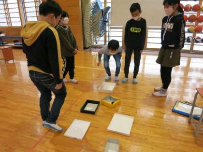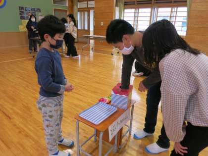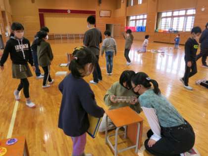 ゲーム大会 公開日 2021/12/22 更新日 2021/12/22 学校風景 1・2年生が、生活科で作ったおもちゃやゲームを全校の人にも楽しんでもらおうと、イベントを企画しました。昨日から放送で呼びかけていました。