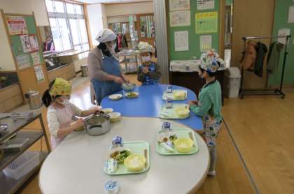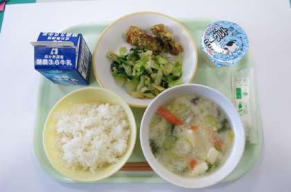 今日の献立は、ちくわのカレーあげ、しょうがひたし、とうにゅう汁、ヨーグルト、です。