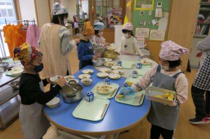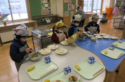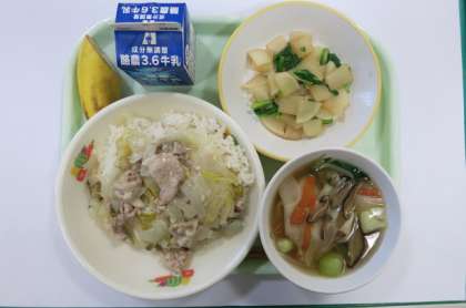 今日の献立は、塩だれぶたどん、かぶのいろどり、ワンタンスープ、バナナ、です。
