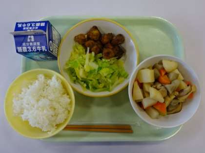 今日の献立は、魚のえごまみそがらめ、ゆでキャベツ、筑前炊き、です。