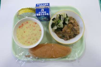 今日の献立は、コッペパン、あっさりチキン、かいそうサラダ、野菜ポタージュ、カットパイン、です。