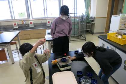 水溶液の性質を、水を蒸発させる実験で確かめています。