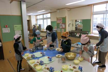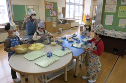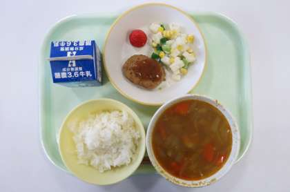今日の献立は、おばけのアッチとうふハンバーグ、さいころサラダ、のらねこスープ、いちご、です。