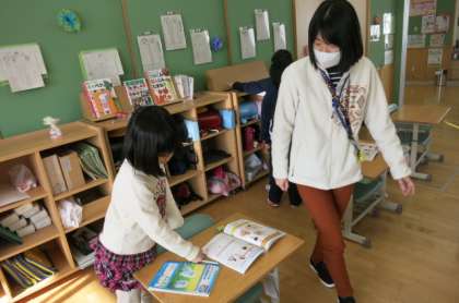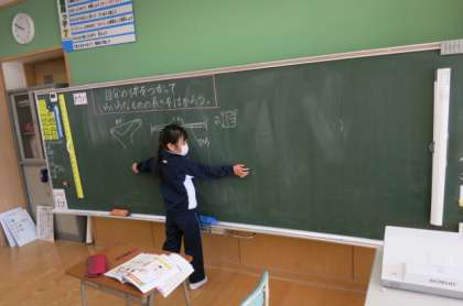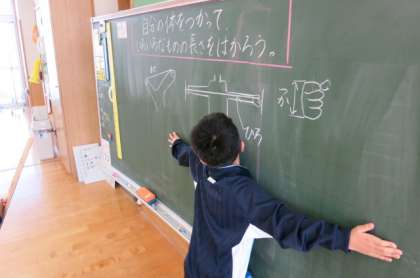 2年生 算数科 体の部分で物の長さを測る活動をしていました。