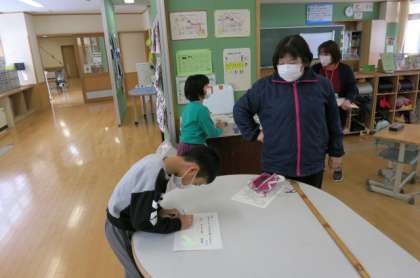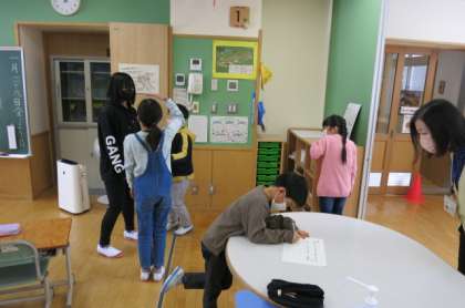 今日は、ファミリーのペアで、長さが1メールのものを校舎内で探し、実際に測ってみる活動をしました。