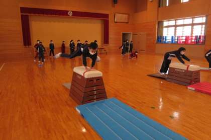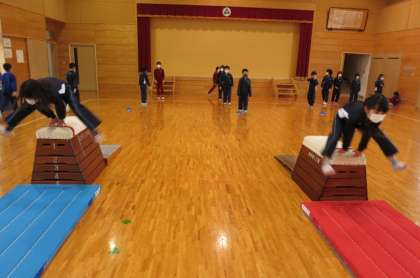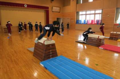 下学年 体育科 跳び箱、開脚跳びに挑戦していました。両足で強い踏み切りができるよう練習していました。