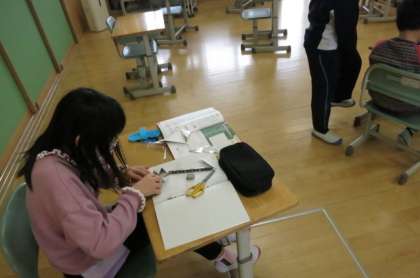3年生算数科 コンパスを使って三角形を描き、切り取ってノートに貼り付けています。