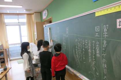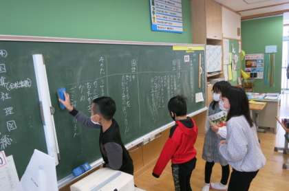 一年間のいろいろな教科の学習でつくった作品の中から、お気に入りのものを黒板に紹介していました。