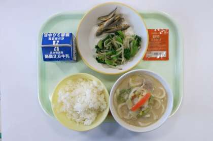 今日の献立は、小あじのからあげ、な花びたし、白ごまとうにゅううどん、五目ふりかけ、です。