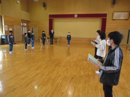 1、2、3年生が静かに見守る中、登校班、委員会、ファミリーが6年生から5年生、4年生に引き継がれました。