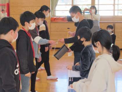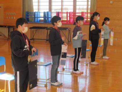 1〜5年生からのプレゼントを受け取った後、6年生はこれまでの感謝の気持ちを伝えようとウォールポケットのプレゼントを渡しました。