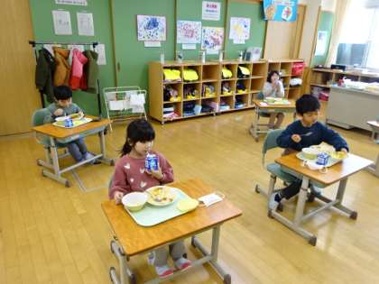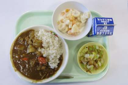 今日の献立は、カレーライス、ふくじん和え、フルーツヨーグルト、です。