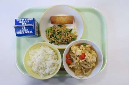 今日の献立は、親子煮、はるまき、なっとう和え、です。