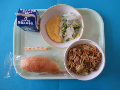 今日の給食は、コッペパン、牛乳、やきそば、オムレツ、えごまドレッシングサラダ、ぼうチーズです。子供たちは、コッペパンにやきそばをはさんで食べるなど、おいしくいただきました。