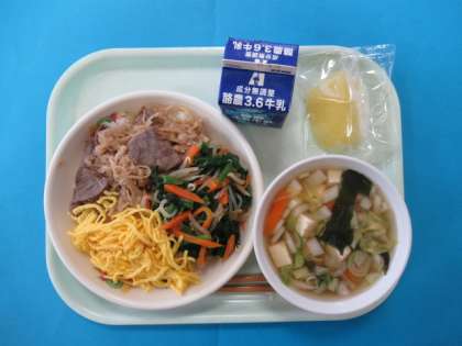 今日の給食は、ビビンバ(焼き肉、ナムル、きんし卵、ごはん)、牛乳、ちゅうかスープ、れいとうりんごです。彩りのよいビビンバに食欲もアップします。