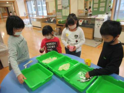 3年生の理科では、モンシロチョウの幼虫を育てています。3年生だけでなく、1、2年生も興味津々です。「えさ食べてるよ」と幼虫の動きに惹きつけられています。これから大きく育っていくのが楽しみですね。