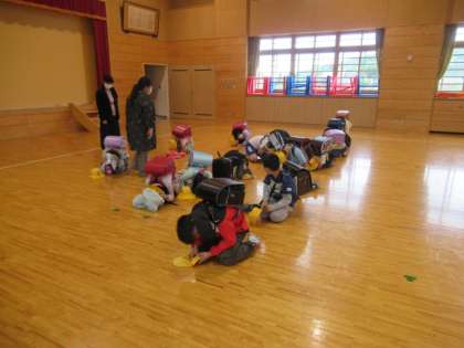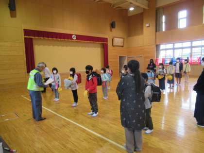 下校の前に、子供たちは樫の子ホールに集まり、生徒指導担当教員より下校中の安全について話を聞いています。