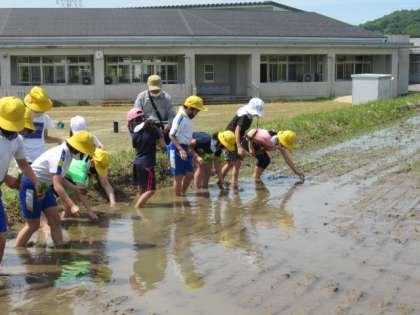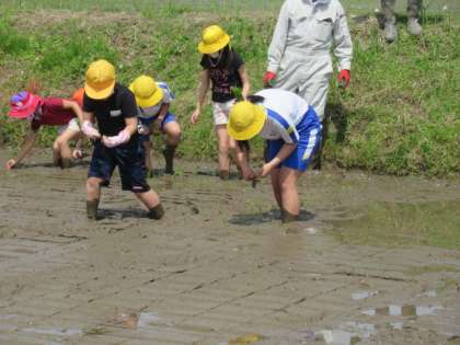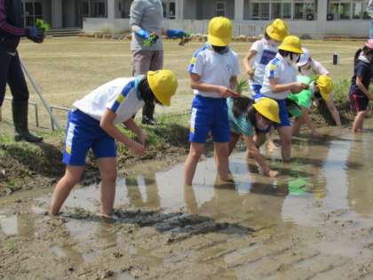 田植え体験2 公開日 2022/05/10 更新日 2022/05/10 学校風景 田に足を入れた子供たちは、「気持ち悪い〜」と言いながらも、普段味わえない感覚を楽しんでいるようでした。そして、一歩ずつゆっくりと植え始めました。