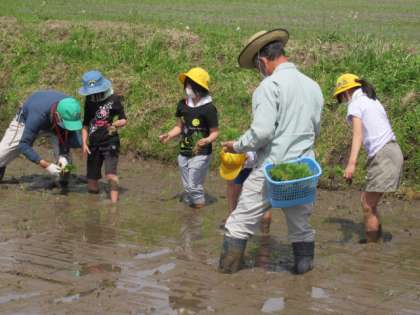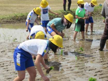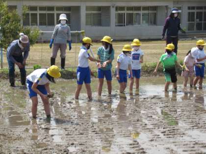 田植え体験4 公開日 2022/05/10 更新日 2022/05/10 学校風景 地域の方、保護者の方にお手伝いいただきながら、無事田植えを行うことが出来ました。今日植えた苗は、弱々しい感じがしますが、これからぐんぐん成長していきます。苗がどのように生長していくか、よく見ていってほしいと思います。秋の収穫も楽しみです。