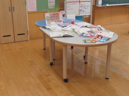 教室の横には、現在学習している内容の本が並べてあります。学んでいる内容をより充実するために、準備しています。