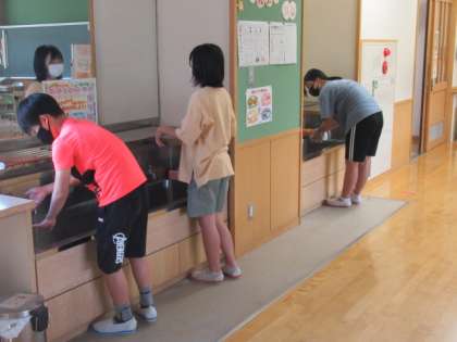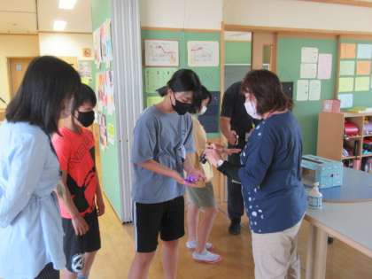 高学年でも手洗いの確認をしました。手の状態がよく分かり、子供たちの励みになっています。