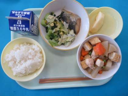今日の給食は、ごはん、牛乳、あつあげの中華に、さわらのさいきょうやき、ちんげんさいソテー、りんごです。今日の給食も野菜がたっぷりで、バランスのよいメニューでした。