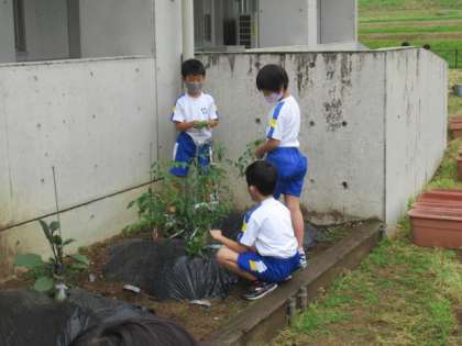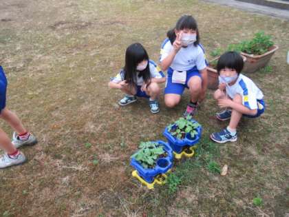 気付きがいっぱい 公開日 2022/05/31 更新日 2022/05/31 2年生 朝、1、2年生はアサガオや野菜の様子を見に行っています。「あっ、あぶらむしがいる!」「葉っぱが虫に食われているよ」と気付きがたくさんあります。自分の大切にしている野菜たち。日々変化していく中、とても気になるようです。