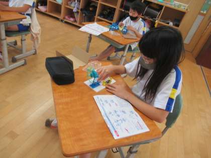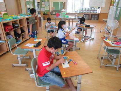 モーターを回そう 公開日 2022/06/01 更新日 2022/06/01 4年生 4年生は、理科でモーターを回す学習に取り組みました。1つの輪になるよう、モーター、スイッチの回路を作りました。モーターが回ると大喜びでした。
