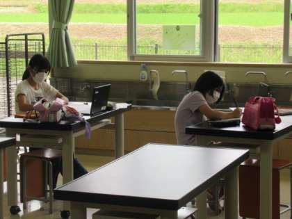 5・6年生の図工では、富山の未来をテーマに絵を描いています。こんな富山になったらないいなと思いを表しています。集中して、熱心に取り組んでいました。