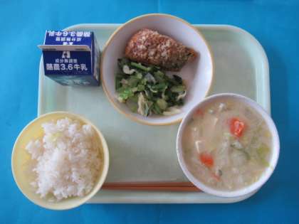 今日の給食は、ごはん、牛乳、ごじる、さかなのたつたあげ、こまつなひたしです。ごじるは、優しい味で、おいしくいただきました。今日の給食では、クイズもあり、委員会の子供たちが楽しい時間を演出しました。