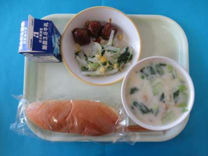 今日の給食は、コッペパン、牛乳、ほたてのクリームに、みずなのサラダです。クリームには、ほたての風味がたっぷりでとてもおいしくいただきました。