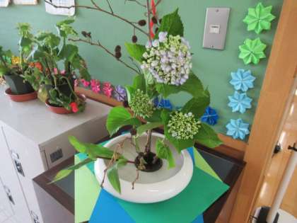 学校の正面には、アジサイが生けられています。しばらく雨が続きそうですが、つゆも間近のようです。