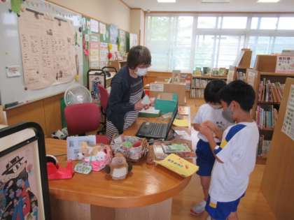図書室には、子供たちの読みたい本がいっぱいです。この日も、本を借りる子供たちが来ていました。本の貯金通帳も、どんどんたまることでしょう。楽しい本を見つけてください。