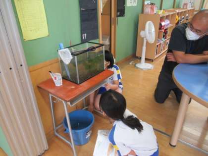 5年生は、メダカを育てています。「たまごがないかな」と水槽を探していました。「そもそも、オスとメス、両方ともいるのかな」と、メダカをよく観察していました。ひれの大きさが違っているということを、実際に見て確かめることが大切ですね。