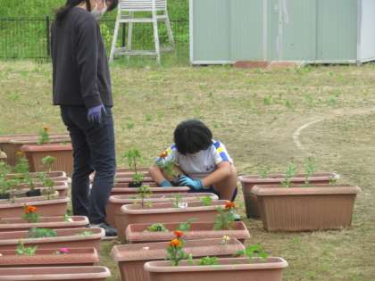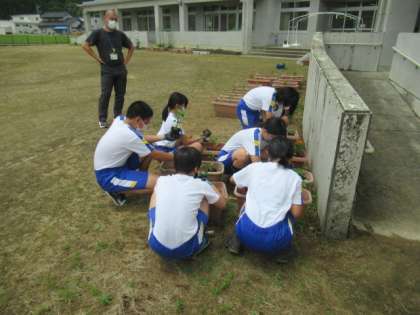 地域の方に、花の苗をいただきました。ありがとうございました。さっそく子供たちはプランターに植えました。花でいっぱいの学校になっています。