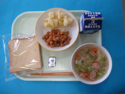 今日の給食は、食パン、牛乳、キャベツスープ、チリコンカン、粉ふきいも、ポケットチーズです。キャベツスープは、野菜のうまみがいっぱいのおいしいスープでした。