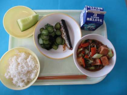 6月10日の給食は、ごはん、ぎゅうにゅう、あつあげのみそいため、いわしのとさに、すのもの、メロンです。とてもあまくておいしいメロンをいただきました。