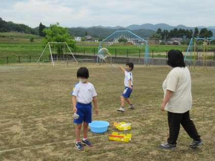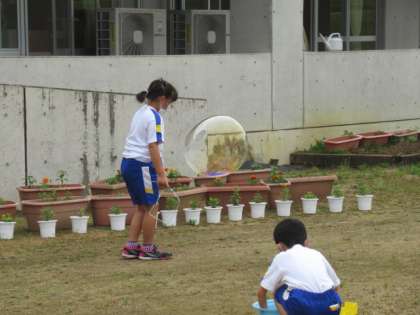 1・2年生は、とてもシャボン玉作りが上手になりました。とても大きなシャボン玉を作りました。