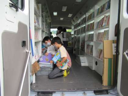 今日は、子供たちが楽しみにしている自動車文庫の日です。思い思いに好きな本を借りて、とてもうれしそうな子供たちでした。