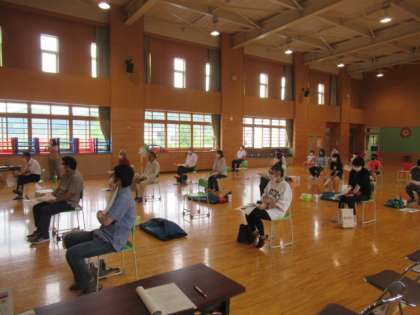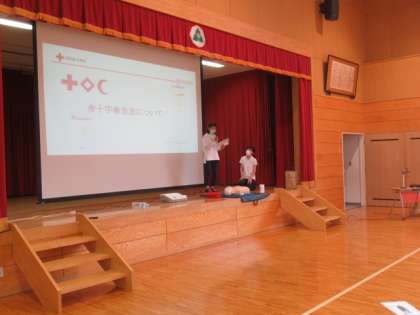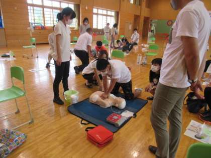 樫尾大学では、救急救命法講座を行いました。日本赤十字富山支部の方においでいただき、児童、保護者、地域の方、教職員が参加しました。