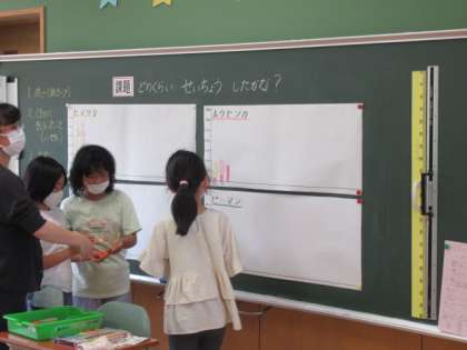 3年生の理科では、子供たちが植物の生長した長さを調べ、グラフに表していました。実際ののびが分かり、植物の成長を実感していました。