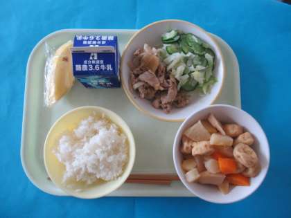今日の給食は、ごはん、牛乳、たきあわせ、ぶたにくのジャンロー、きざみあえ、バナナです。