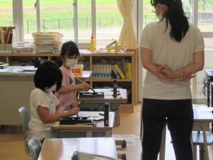 3年生書写では、子供たちはお手本を見ながら毛筆に取り組んでいました。筆遣いにも少しずつ慣れている様子でした。