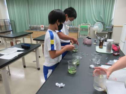 6年生は、日光が当たったジャガイモの葉と、あたってない葉を比べて、日光の役割について調べていました。アルコール脱色法で葉の色を落とし、デンプンのあるなしを比べました。薬品を使いながら、慎重に実験を行っていました。